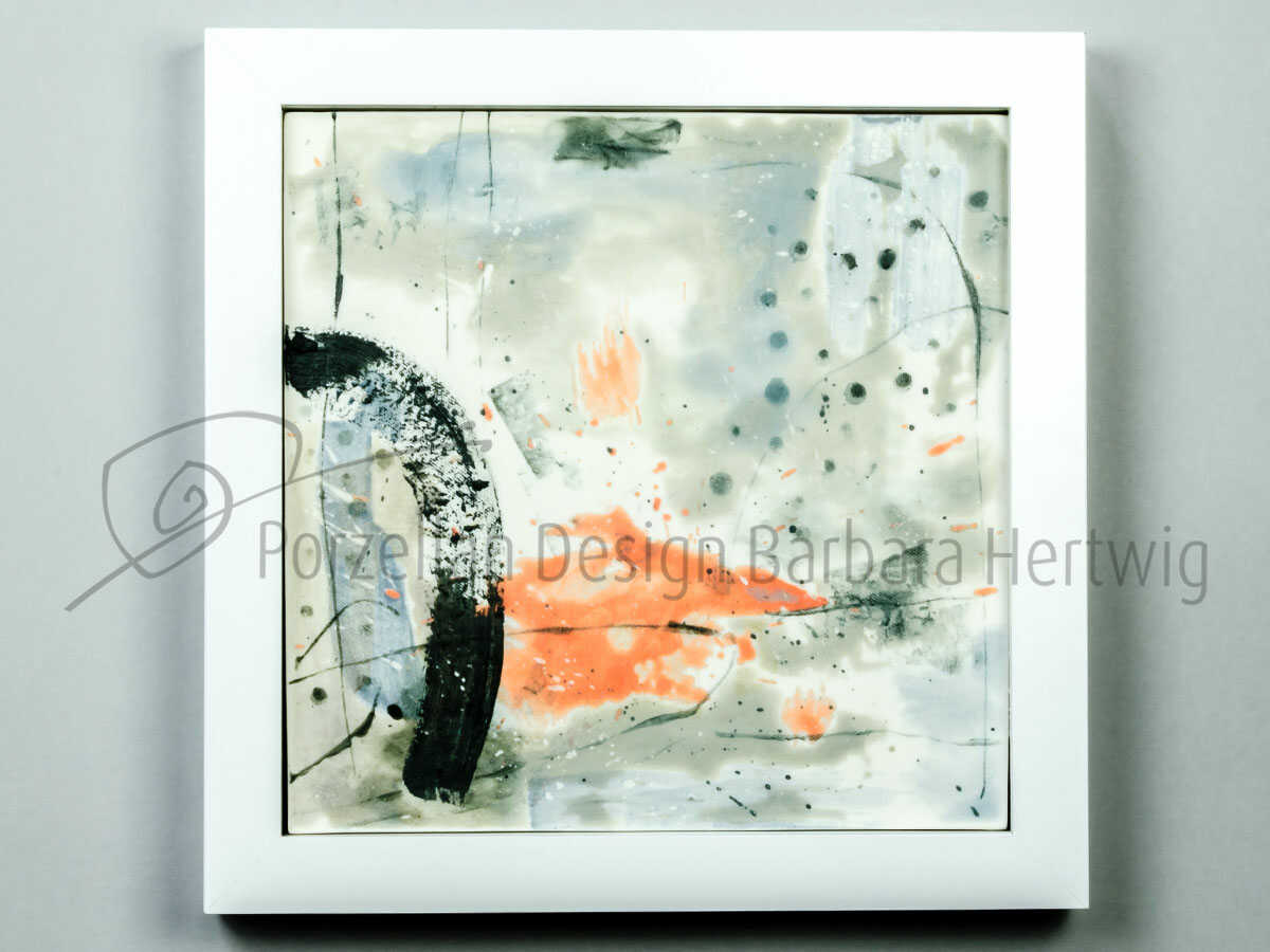 Bild-Kachel (23 x 23 cm inkl. Holzrahmen), handbemaltes Porzellanbild, mittels Pinsel, Lithographie, Umdruck- und zum Teil mit Reservagetechnik dekoriert