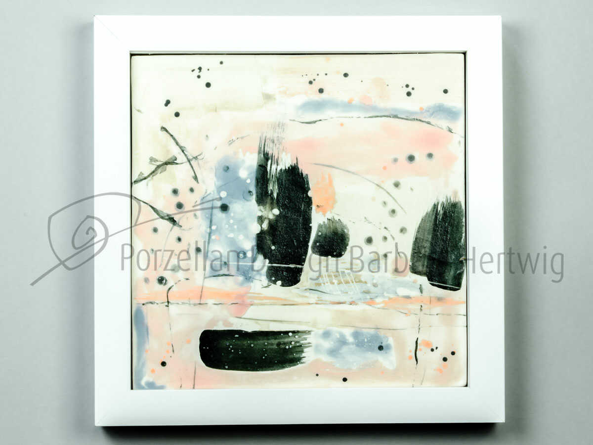 Bild-Kachel (23 x 23 cm inkl. Holzrahmen), handbemaltes Porzellanbild, mittels Pinsel, Lithographie, Umdruck- und zum Teil mit Reservagetechnik dekoriert