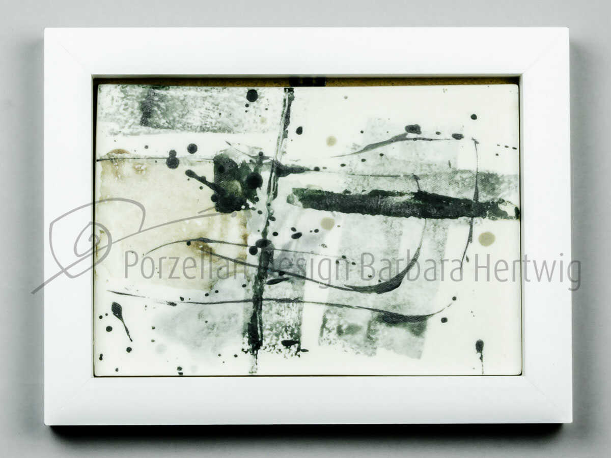 Bild-Kachel (20,5 x 15,5 cm inkl. Holzrahmen), handbemaltes Porzellanbild, mittels Pinsel, Lithographie, Umdruck- und zum Teil mit Reservagetechnik dekoriert