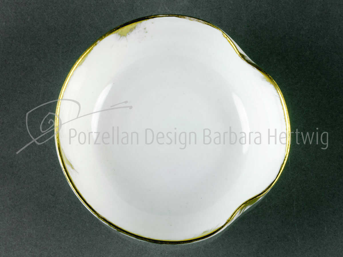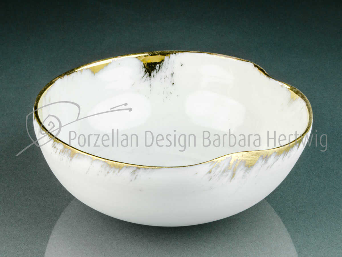 Die Schale ist handgedreht auf der Töpferscheibe und danach individuell verformt von Hand, außen Biskuitporzellan, innen mit transparenter Glasur. Der handbemalte Rand ist mit Echtgoldauflage veredelt. Die Goldauflagen können abweichen vom Produktbild, da jede Schale ein individuell in Handarbeit hergestelltes Unikat ist!