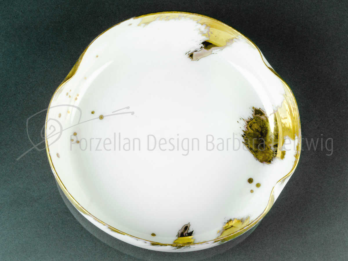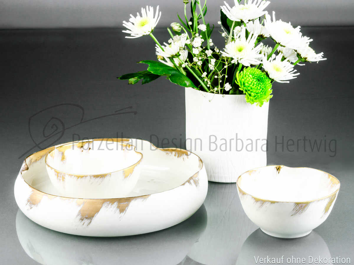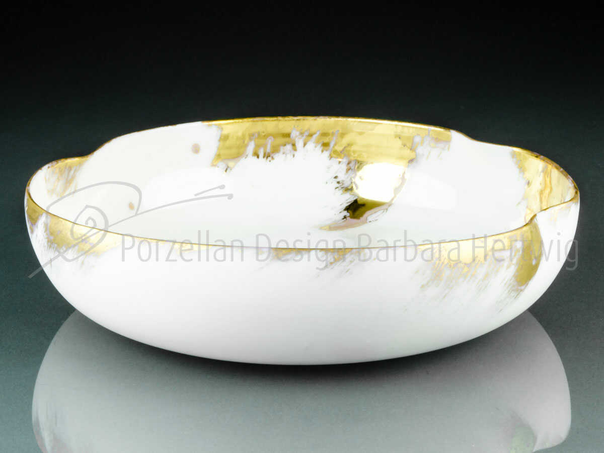 Die Schale ist handgedreht auf der Töpferscheibe und danach individuell verformt von Hand, außen Biskuitporzellan, innen mit transparenter Glasur. Der handbemalte Rand ist mit Echtgoldauflage veredelt. Die Goldauflagen können abweichen vom Produktbild, da jede Schale ein individuell in Handarbeit hergestelltes Unikat ist!