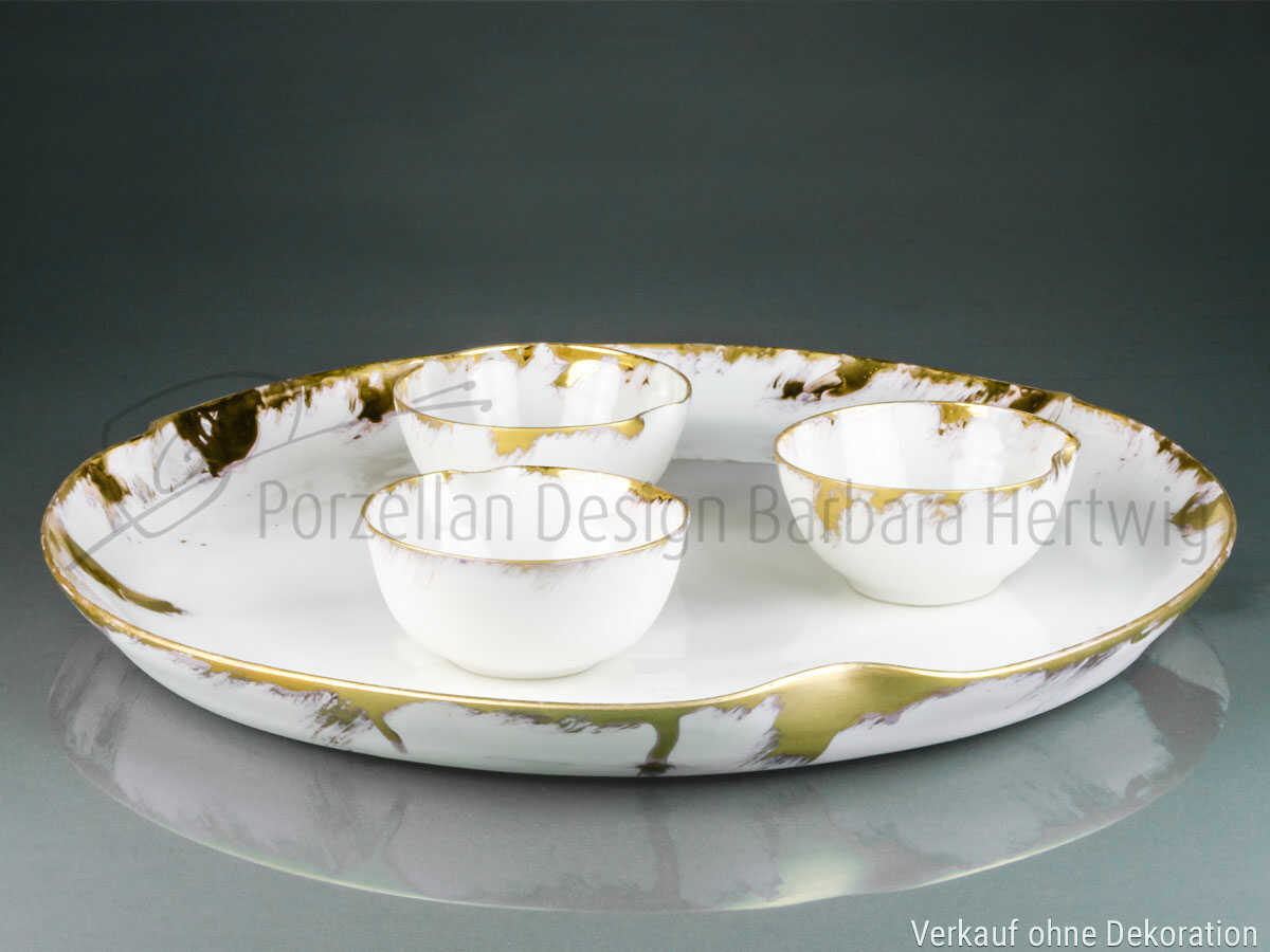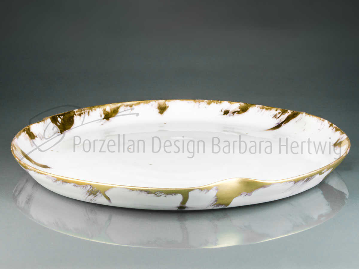 Goldschale aus der Kollektion Medusa (Ø ca. 32 cm). Die Kombination von kühlem Porzellan und handveredelter Goldauflage geben jedem besonderen Moment einen Hauch von Luxus. Ob als Lichtschale, für Obst, Gebäck, Konfekt … – kultivierter gehts nicht!