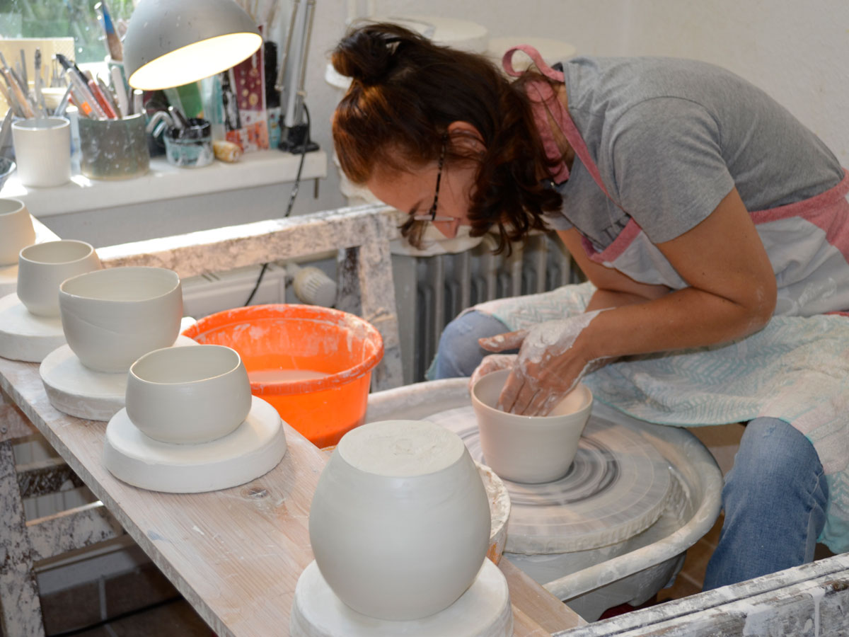 Die Drehkurse beinhalten die Demonstration und Unterweisung in grundlegende Handgriffe der Drehtechnik, Abdrehen, Kerbtechnik, Chattertechnik. Die Masse kann in unterschiedlichen Wandstärken gearbeitet werden. Nach einer Trocknungsphase werden die einzelnen Bearbeitungstechniken erklärt und geübt. Dabei kann die Porzellan-Wandstärke bis zur Transluzenz gearbeitet werden.