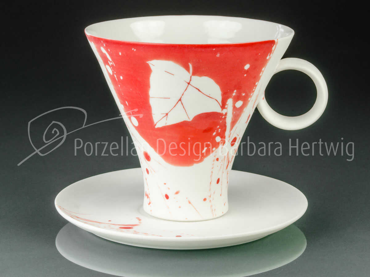 Tasse und Untertasse aus der Kollektion Efeu. Alle Tassen und Untertassen sind aus Porzellan, von Porzellan Design Barbara Hertwig entworfen und produziert, frei auf der Töpferscheibe gedreht und mit selbst entwickelten Terra sigillata mittels Wachsreservagetechnik dekoriert.