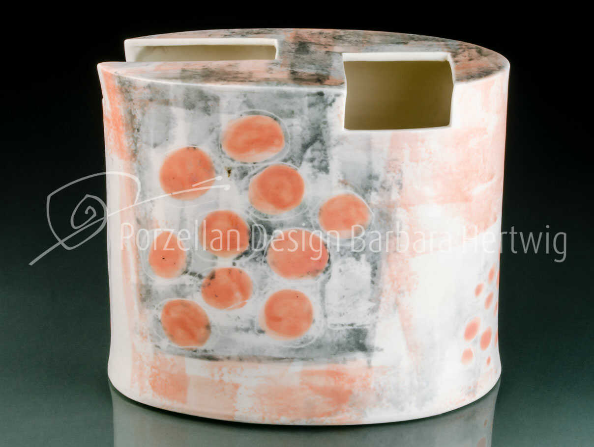 Vasenobjekt, handgedreht auf der Töpferscheibe und danach aufwändig verformt sowie garniert, außen mit selbst entwickelten Terra sigillata in Wachsreservage- und Umdrucktechnik anthrazit-apricot handbemalt, innen mit transparenter Glasur